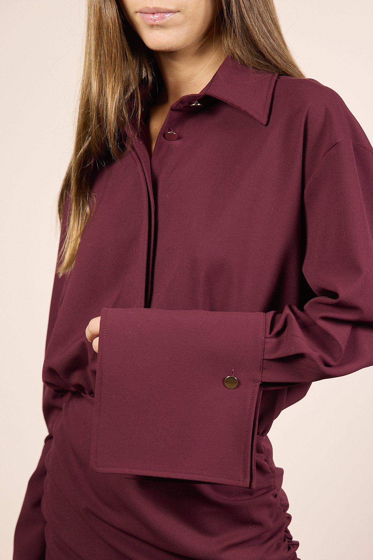 Abito corto, stile camicia sulla parte superiore e silhouette aderente sul fondo, maxi polsini, minigonna drappeggiata ai lati e foderata all’interno Vestibilità regolare. 63% Poliestere – 33% Viscosa – 4% Elastane Fodera: 100% Poliestere