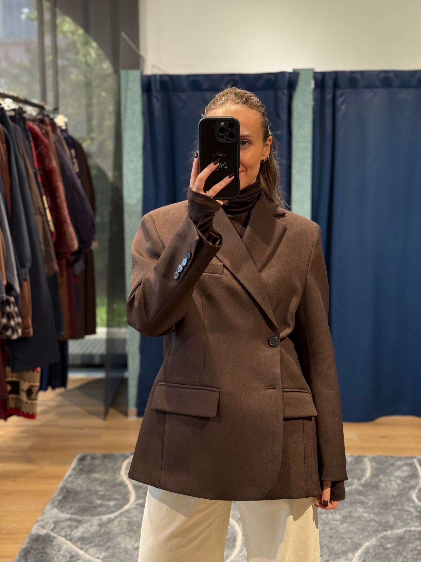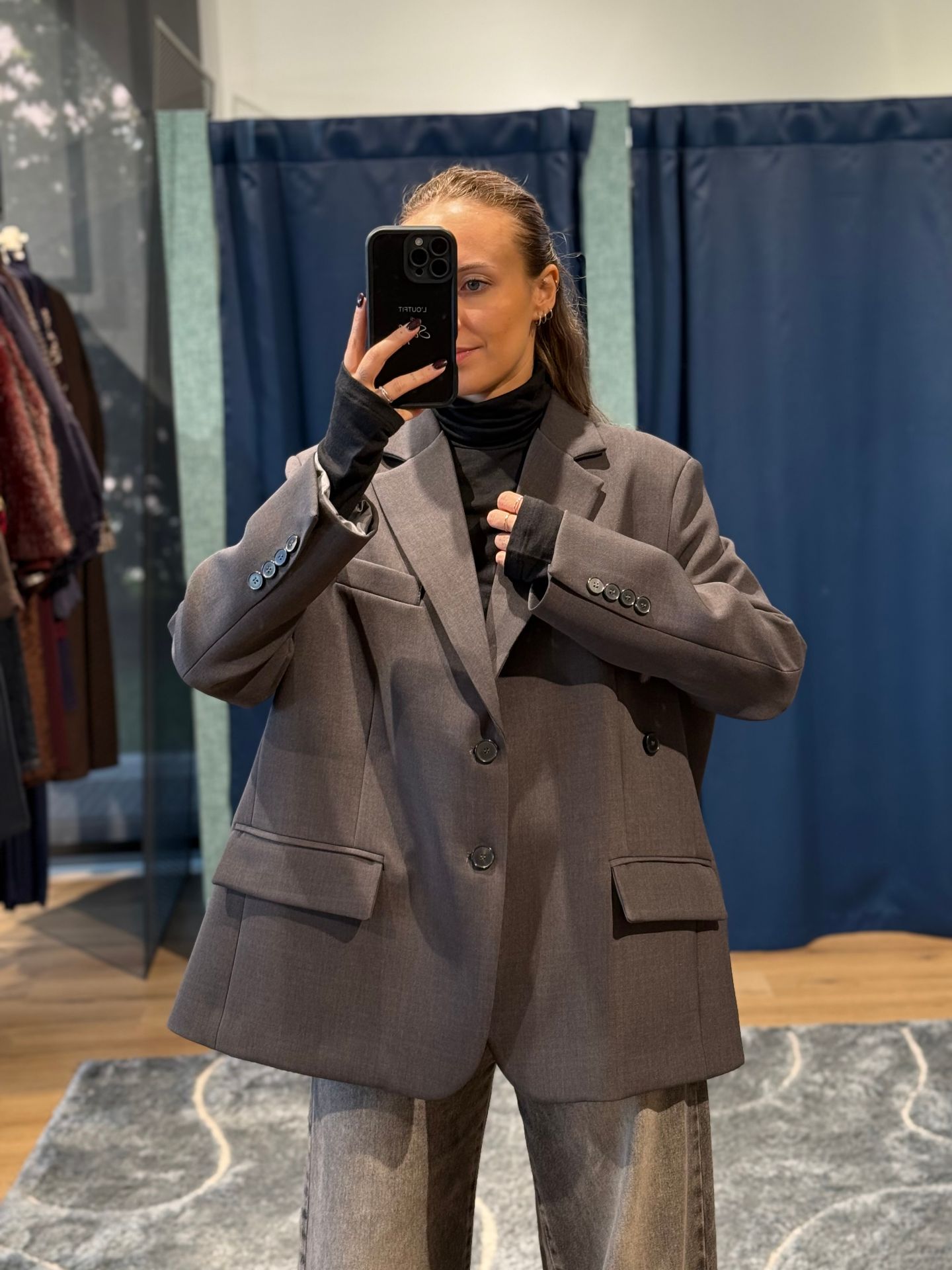 Blazer oversize, tessuto strutturato, con doppia chiusura per indossarlo più oversize o più infiancato. 97% poliestere 3% elastan