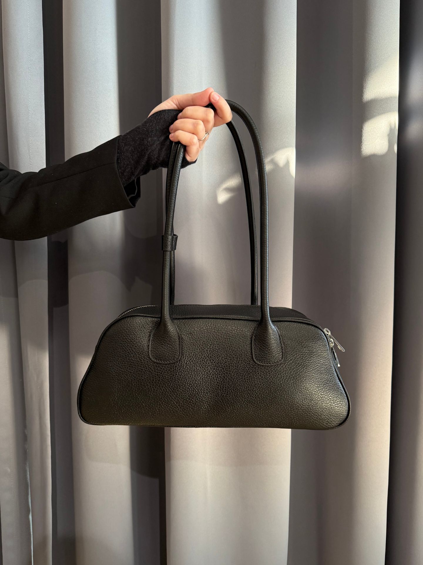 Borsa in vera pelle modello bowling, con manici allungati, chiusura con zip.