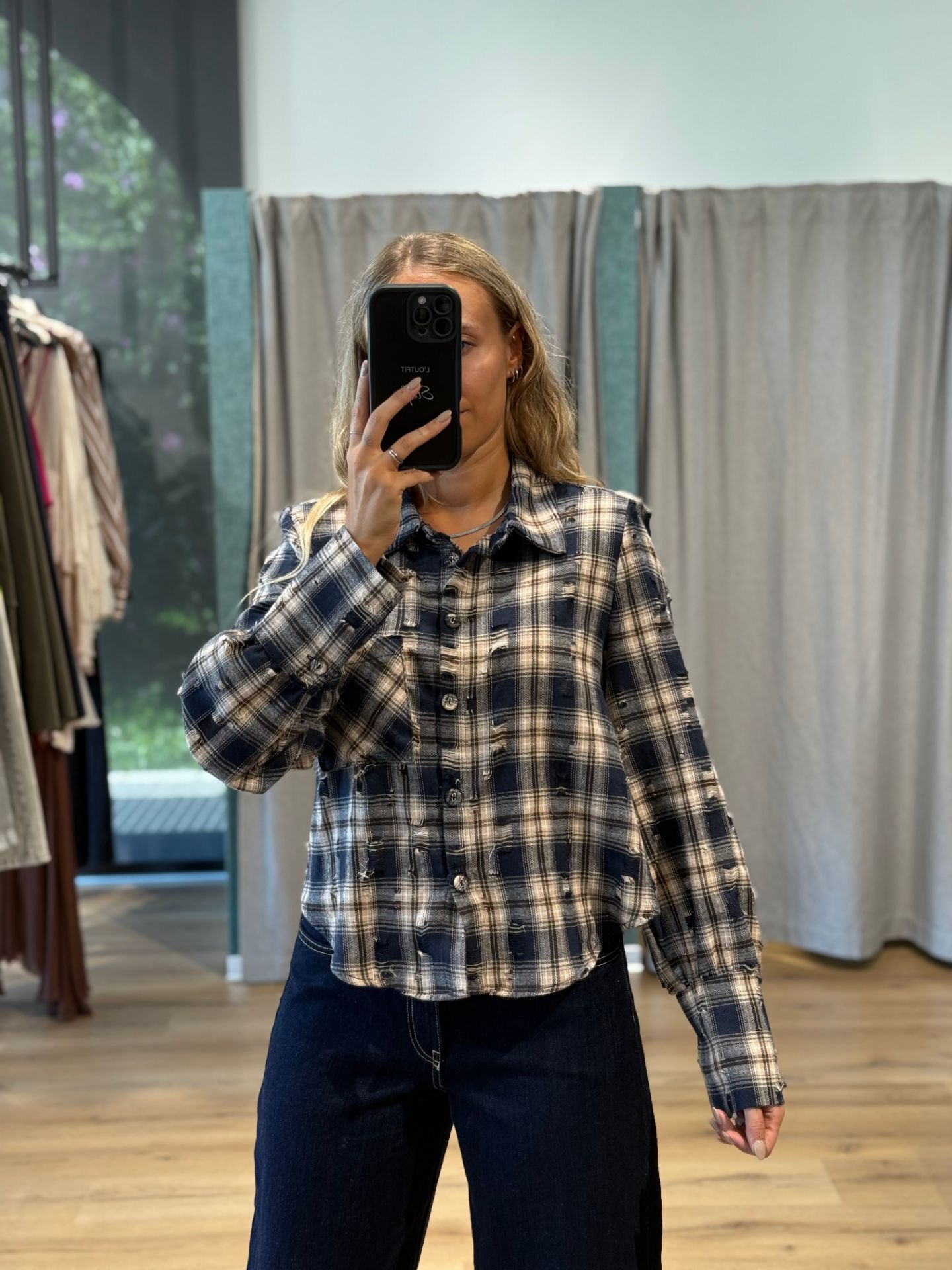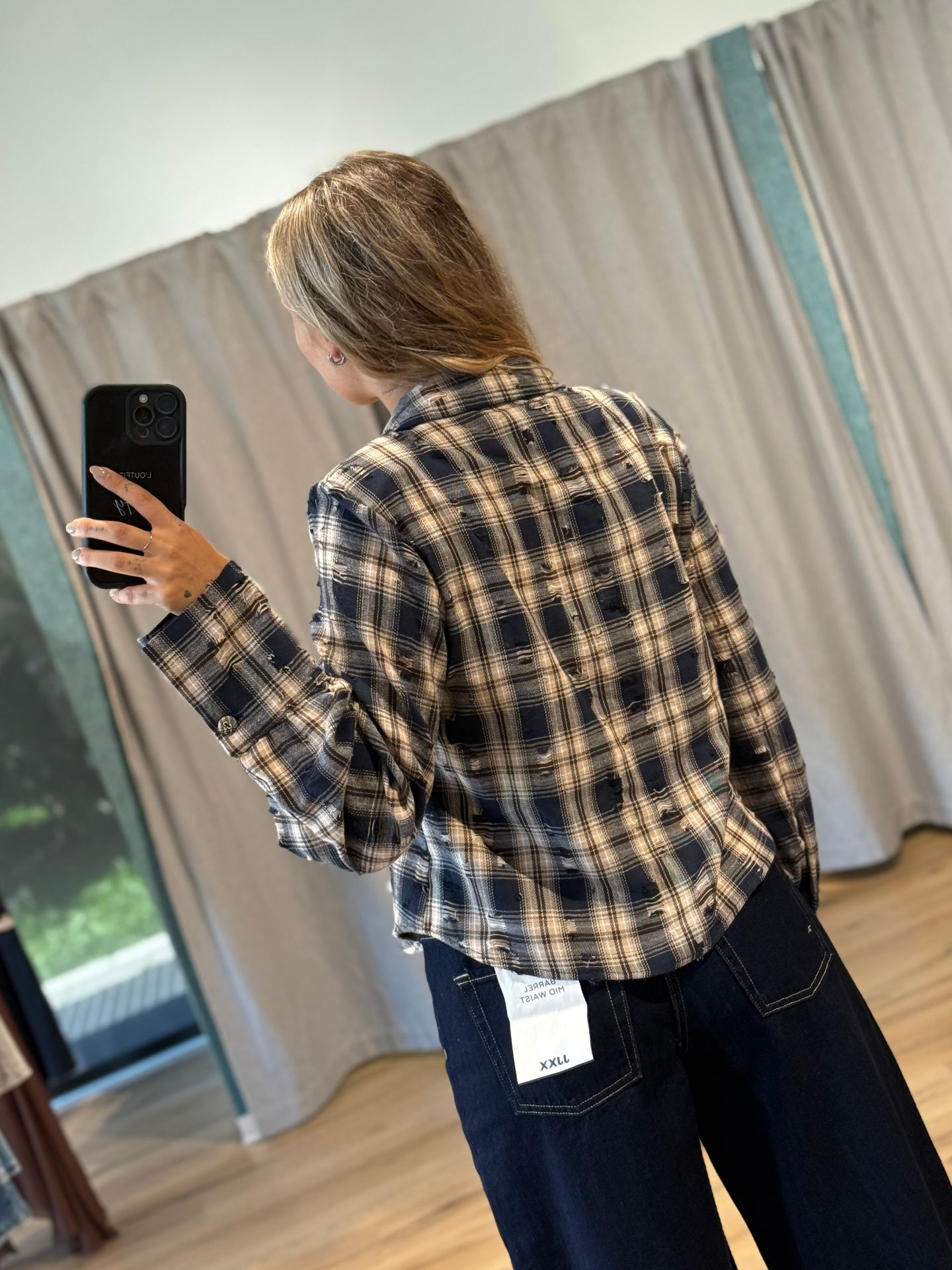 Camicia a quadri con rotture programmate e spalline imbottite. Base blu, beige e marrone