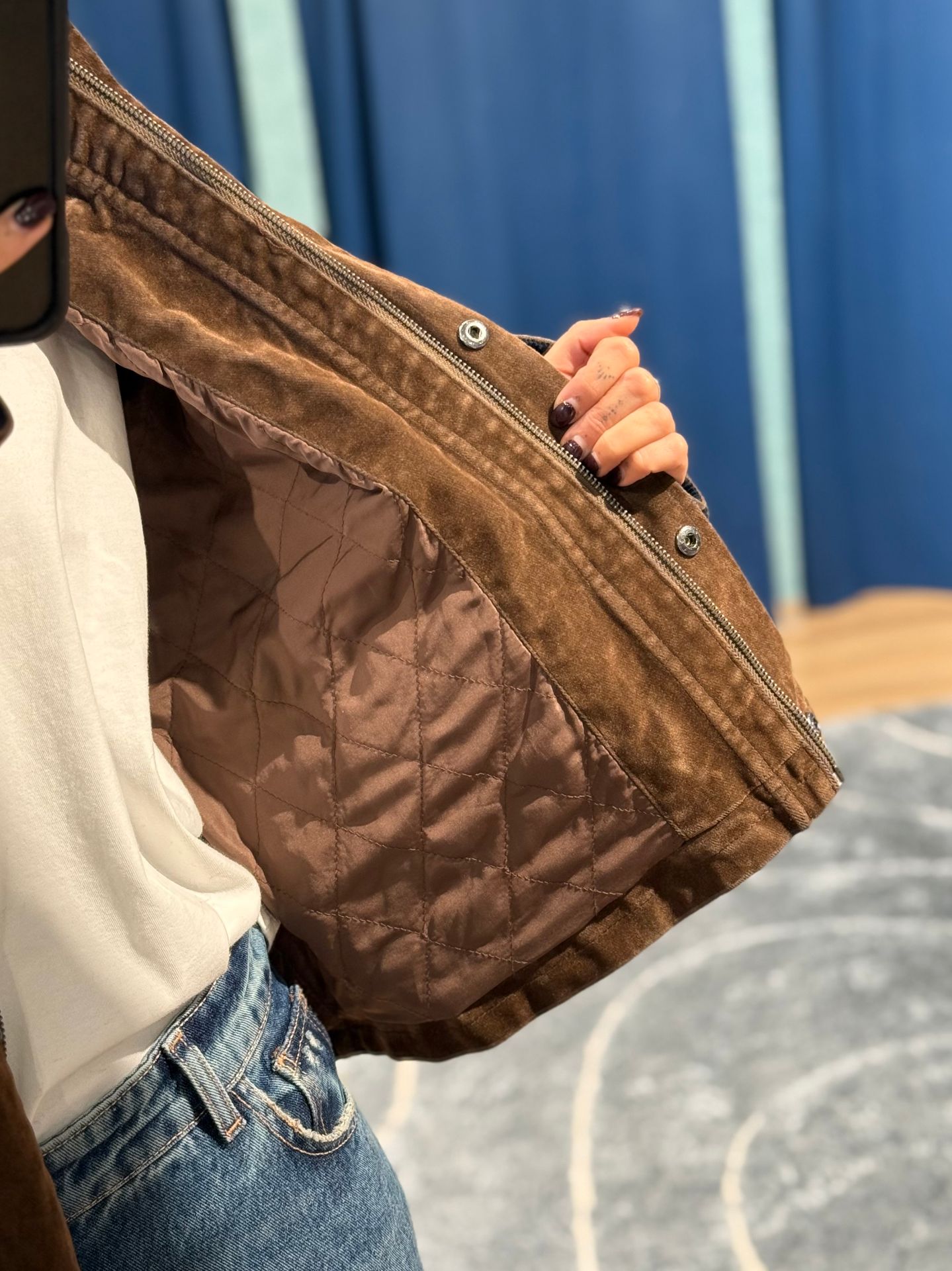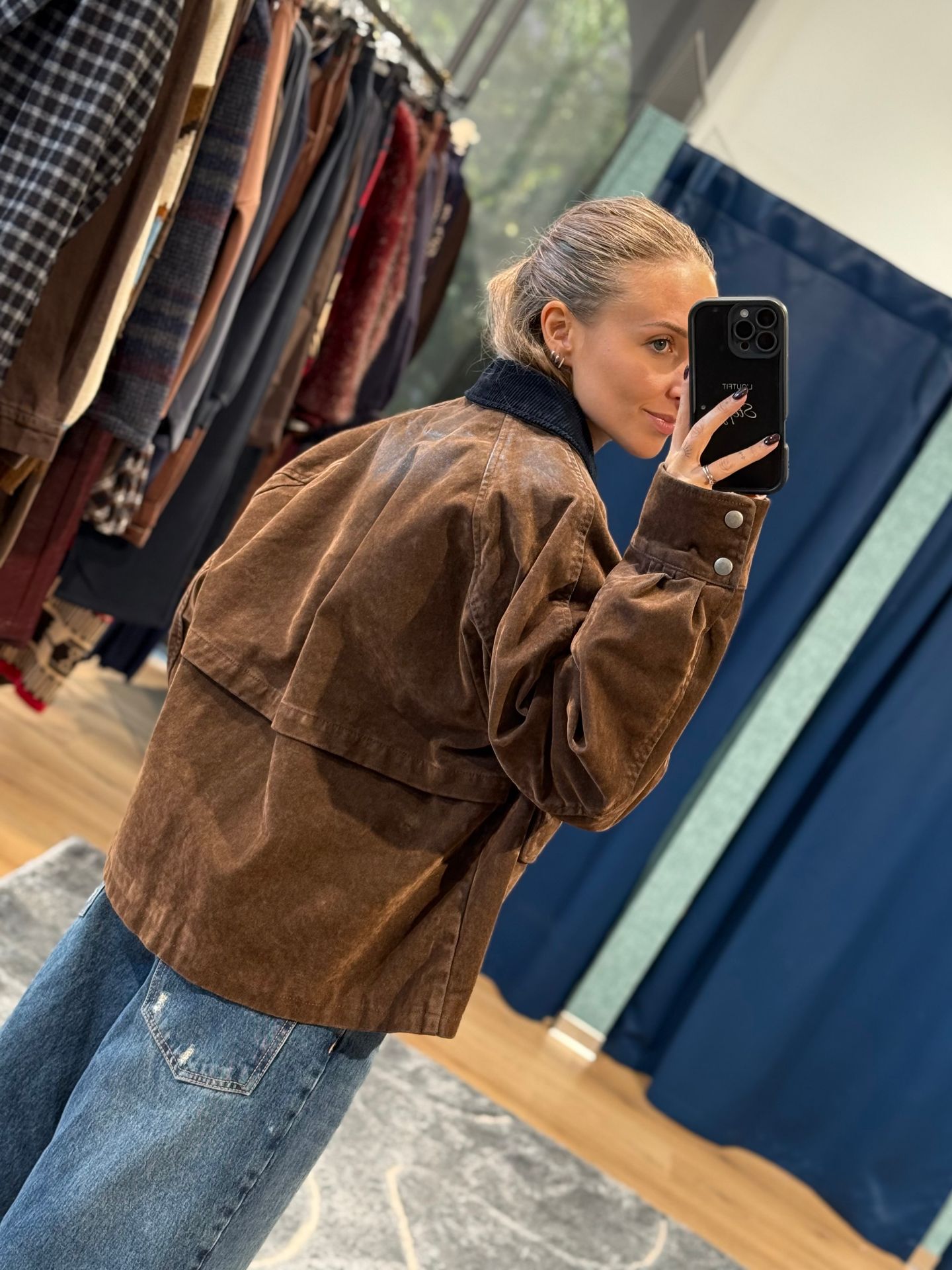 Giacca in denim con floccatura in velluto marrone, con colletto a contrasto blu. 100% Cotone