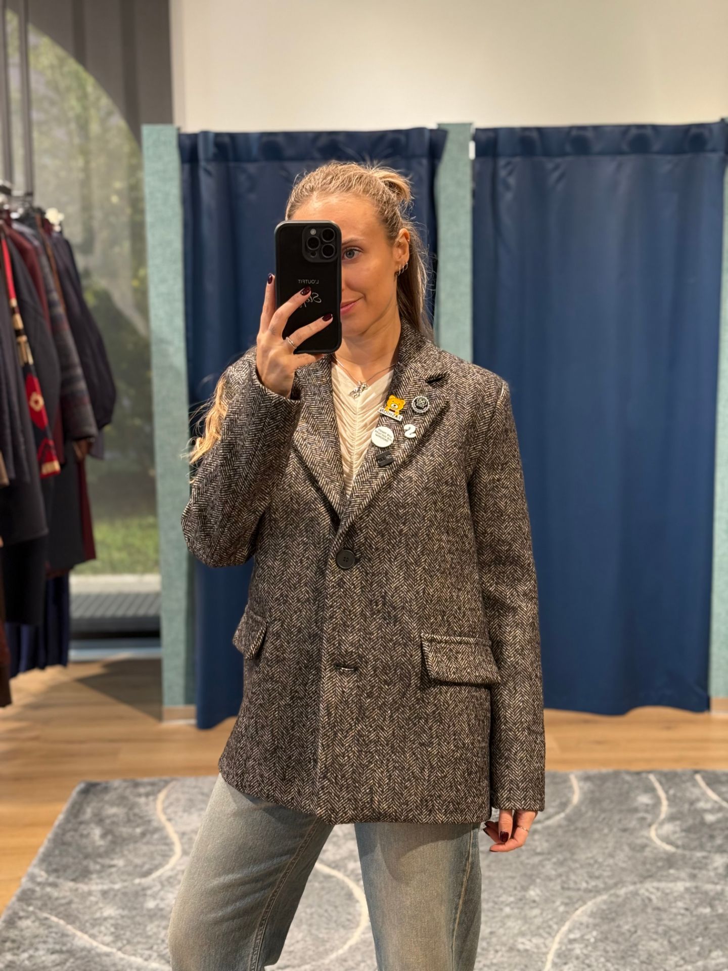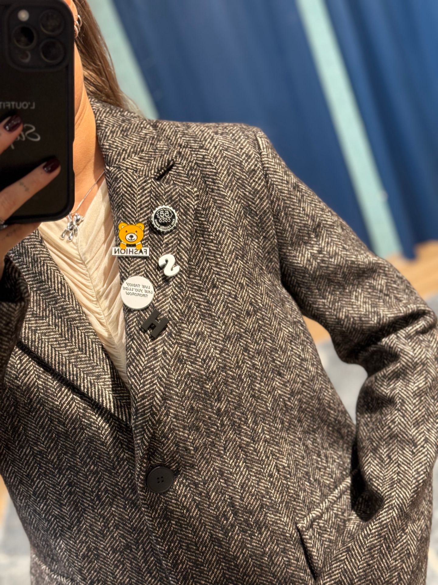 Giacca spigata foderata chiusura monopetto due bottoni. Spille removibili.