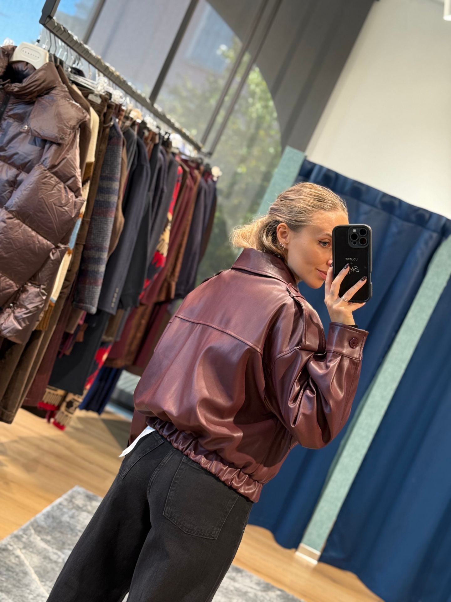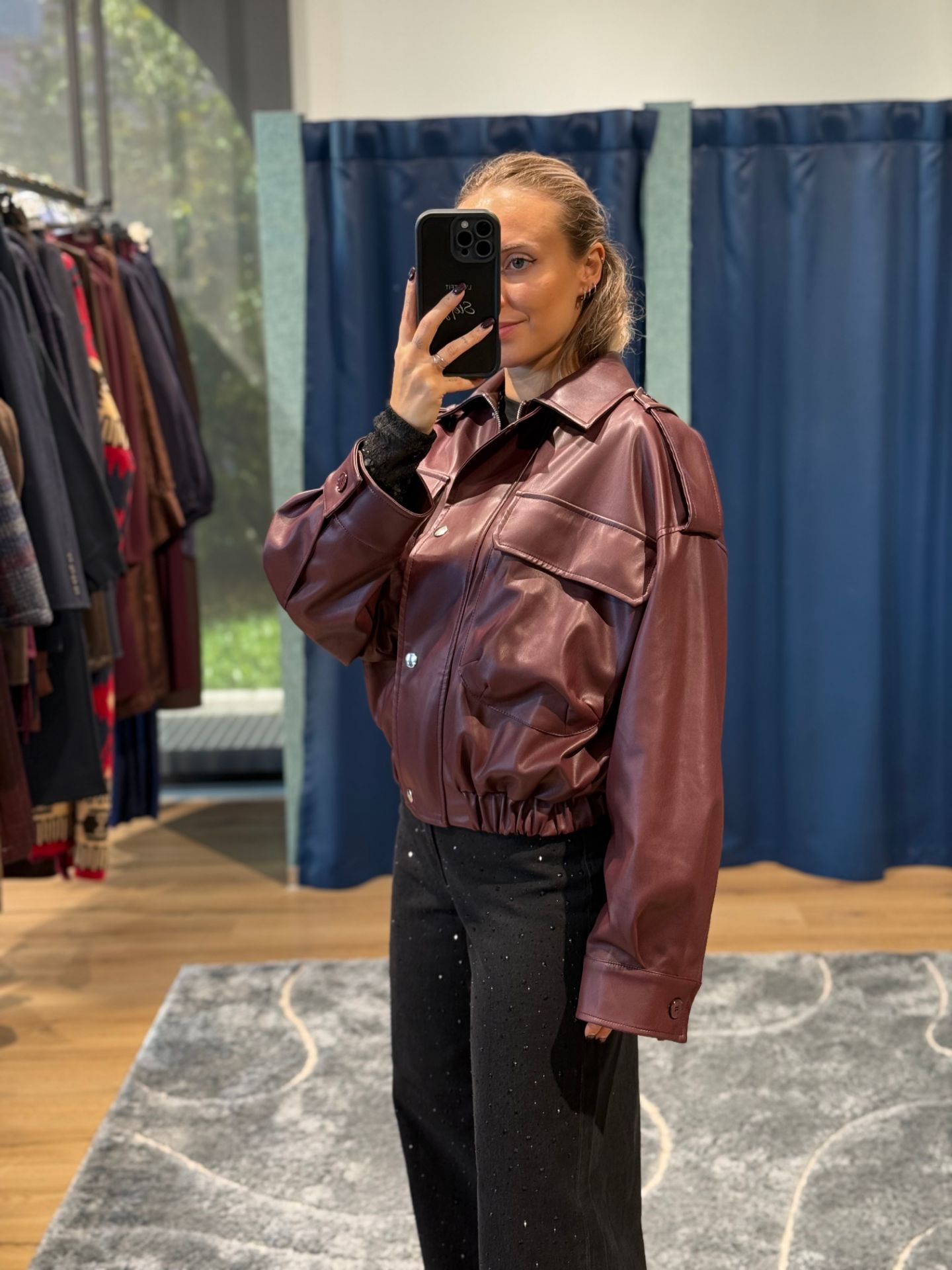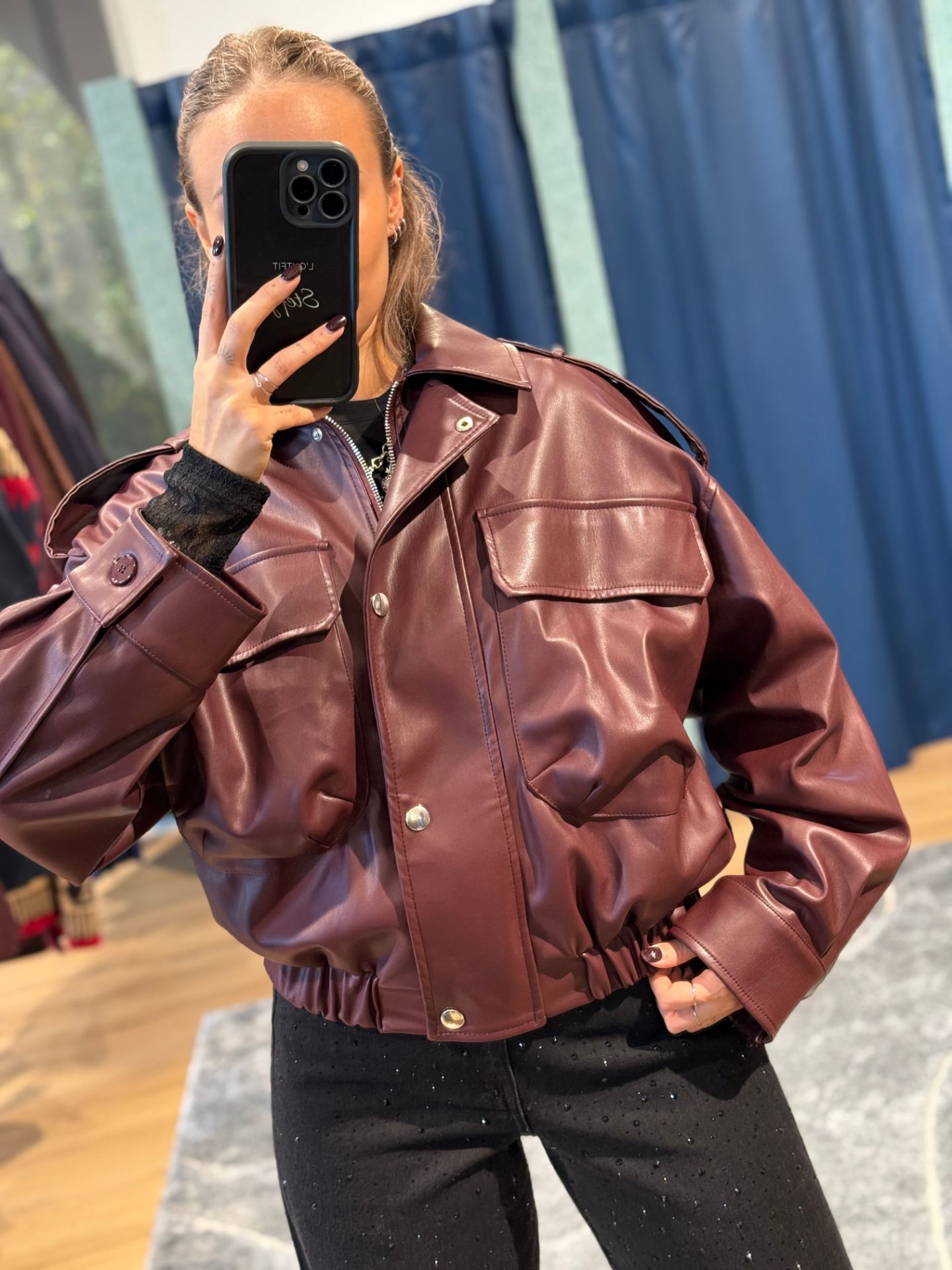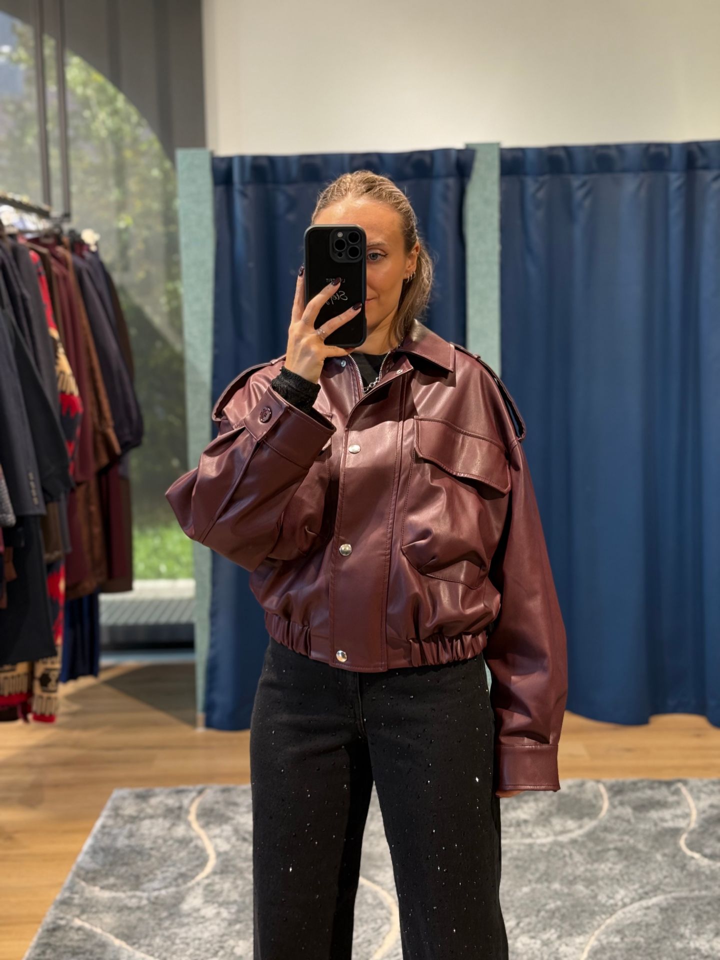 Giubbino foderato in similpelle morbida con tasconi frontali ed elastico in vita, chiusura con zip e bottoni a pressione