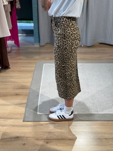 Gonna midi denim in stampa maculata con spacco frontale.