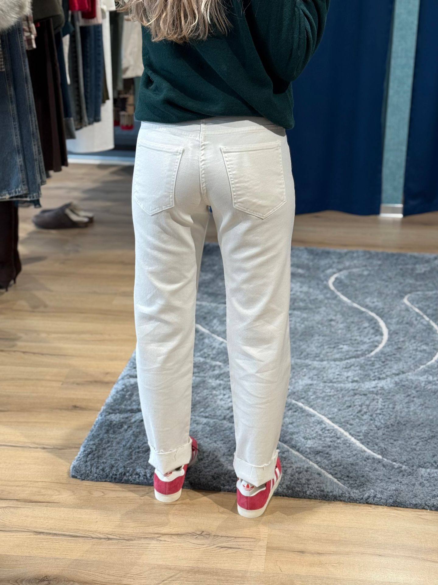 Jeans bianco dritto con taglio a vivo sul fondo, elasticizzato, vestibilità regolare.