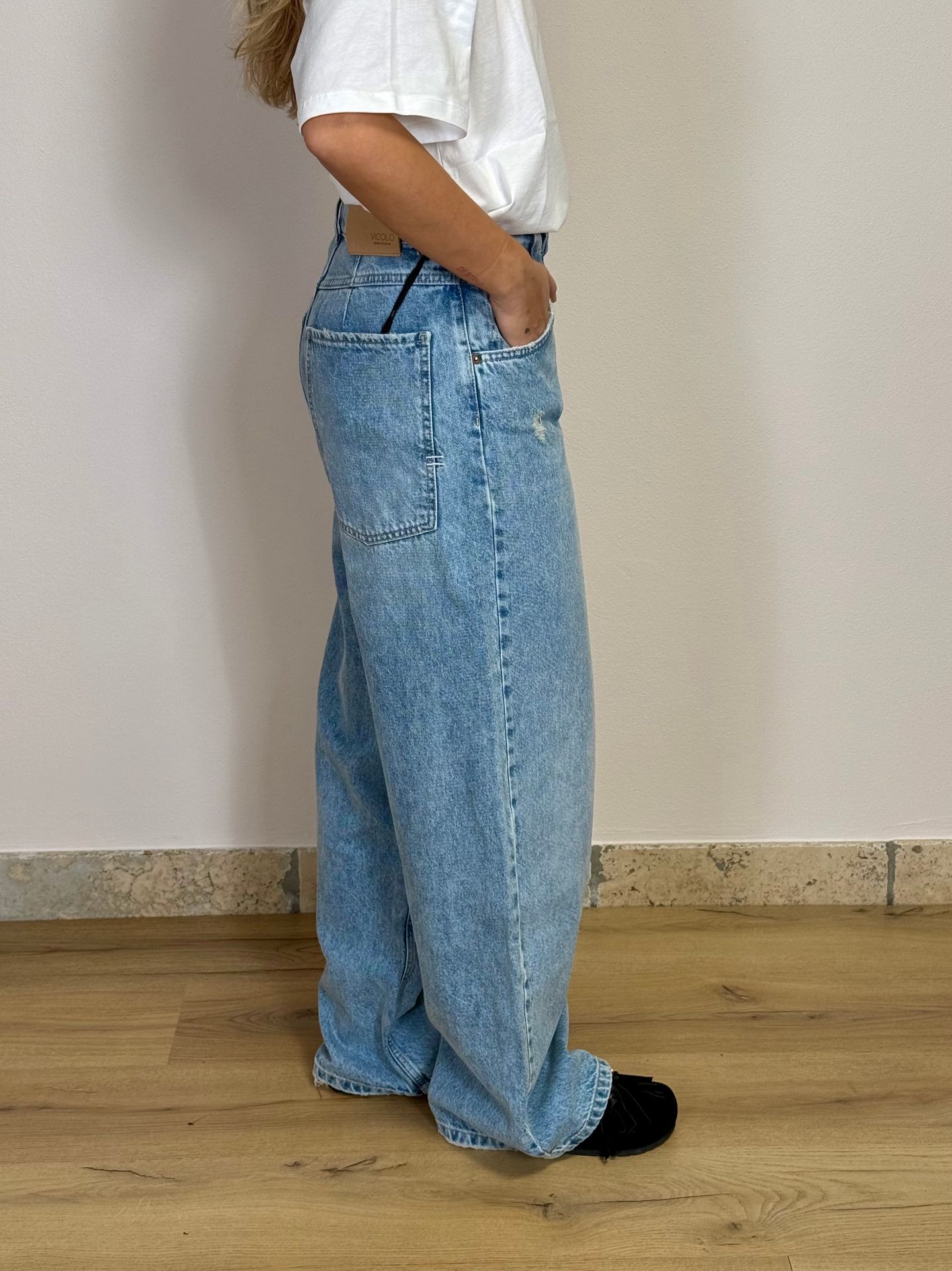 Jeans modello Mia a palazzo gamba larga lavaggio chiaro. 100% Cotone.