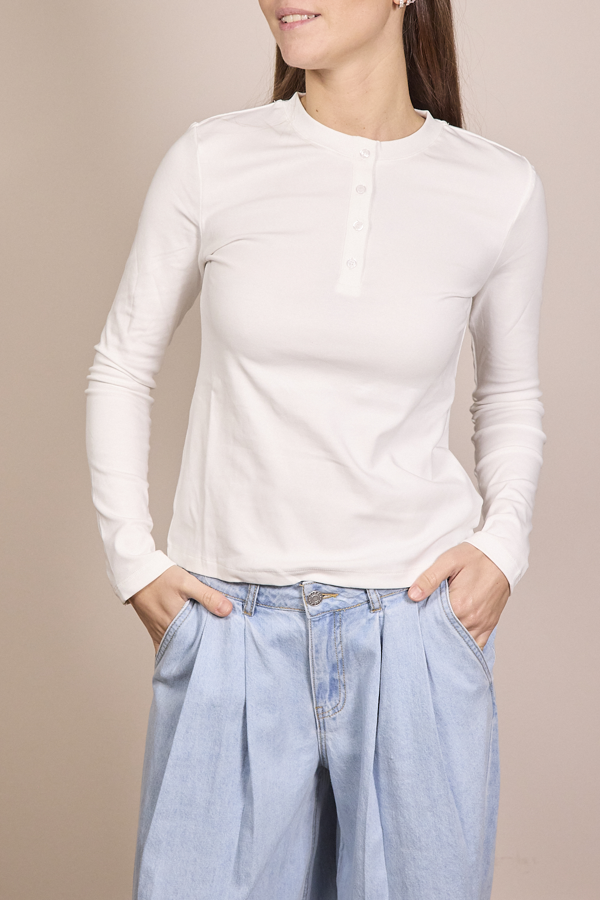 Maglia manica lunga girocollo con bottoncini, in cotone elasticizzato.