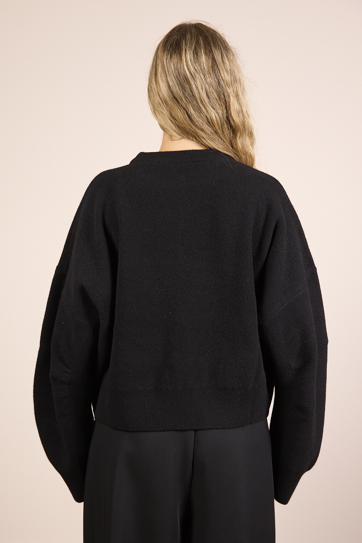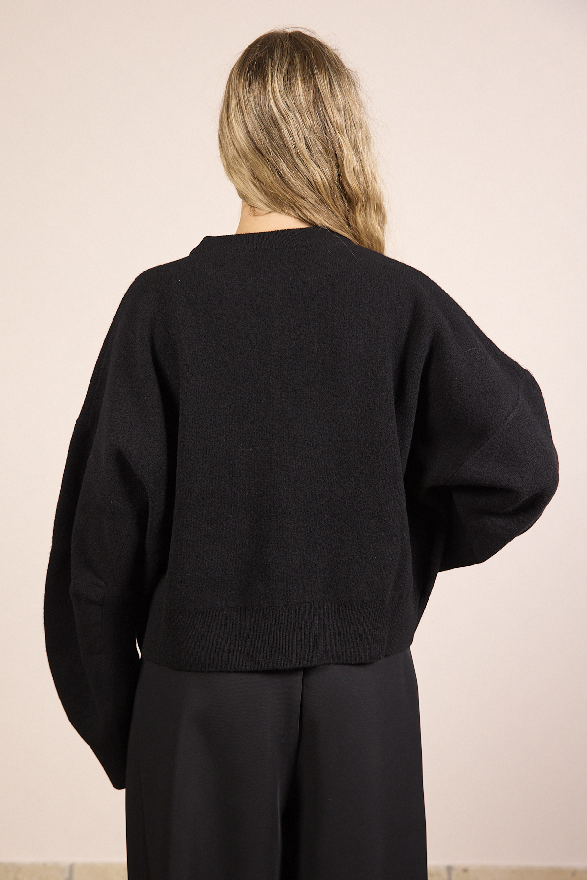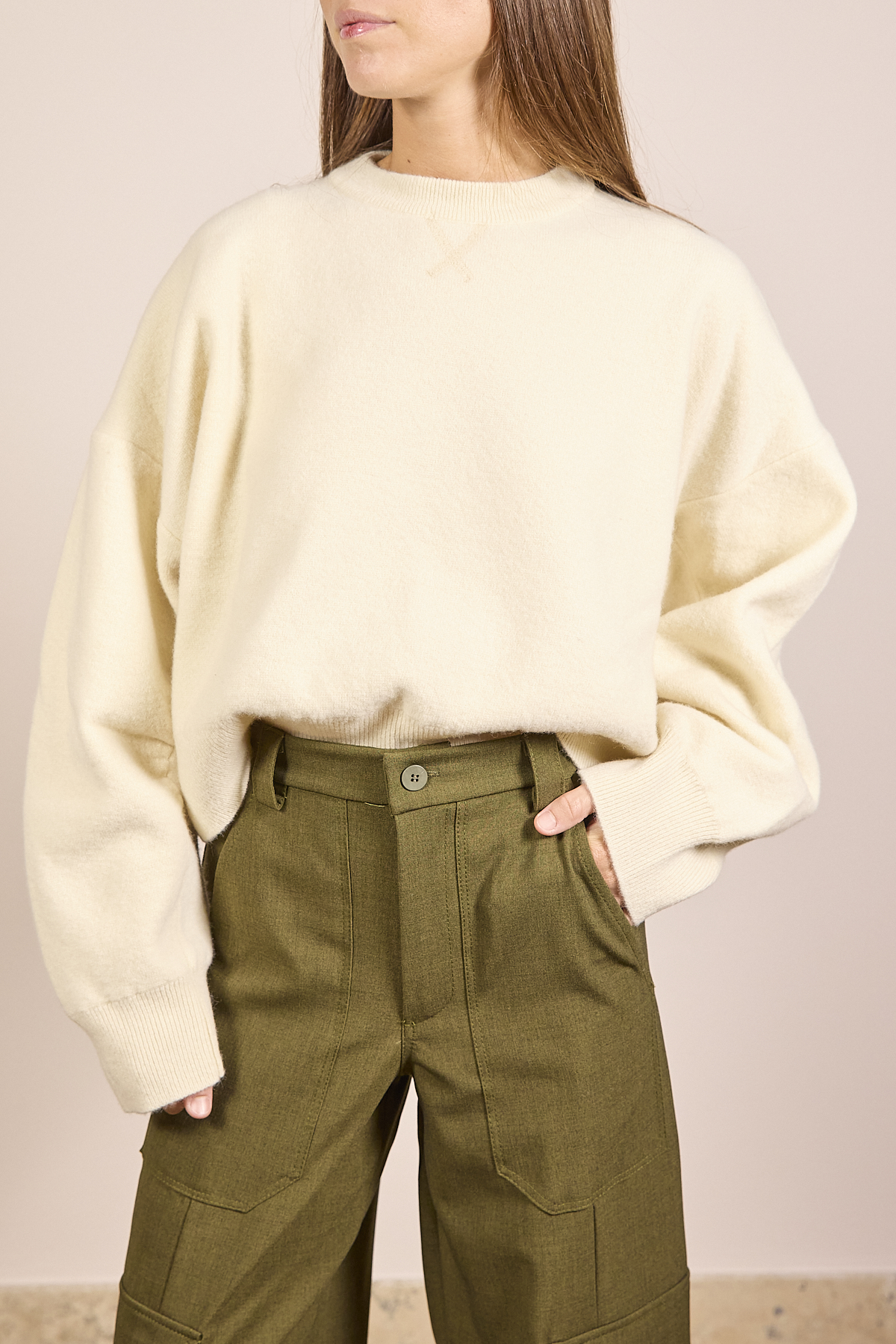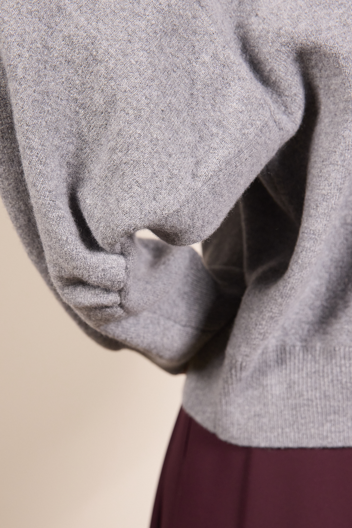 Maglione girocollo a maniche lunghe in 100% lana con dettaglio arricciato sulla manica.