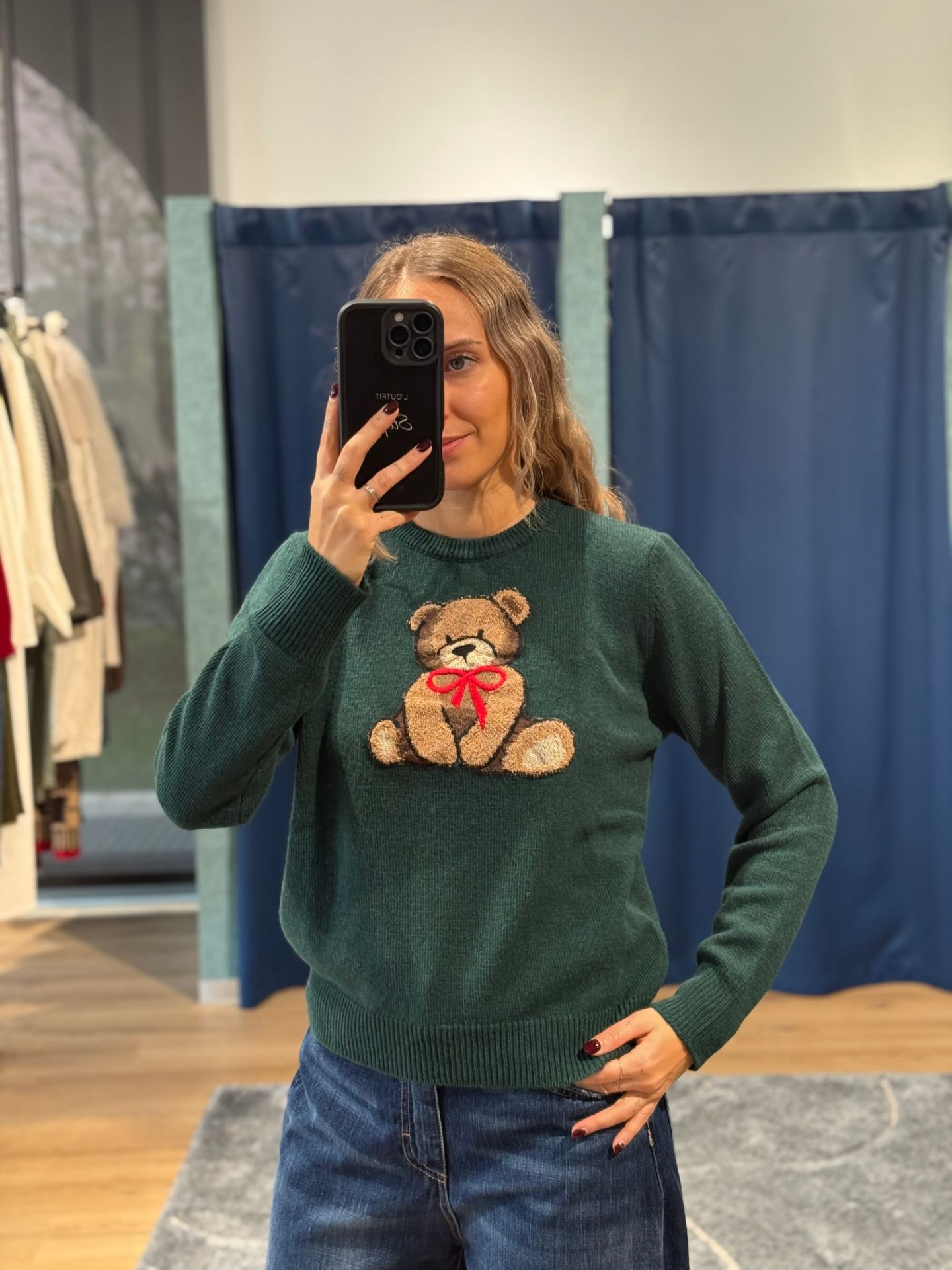 Maglione in misto lana cashmere con orsetto e fiocco ricamato.