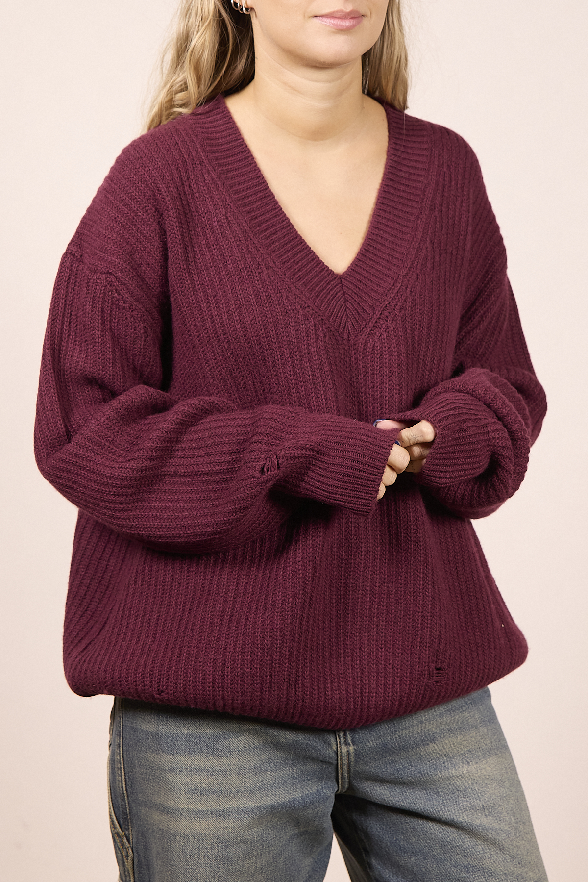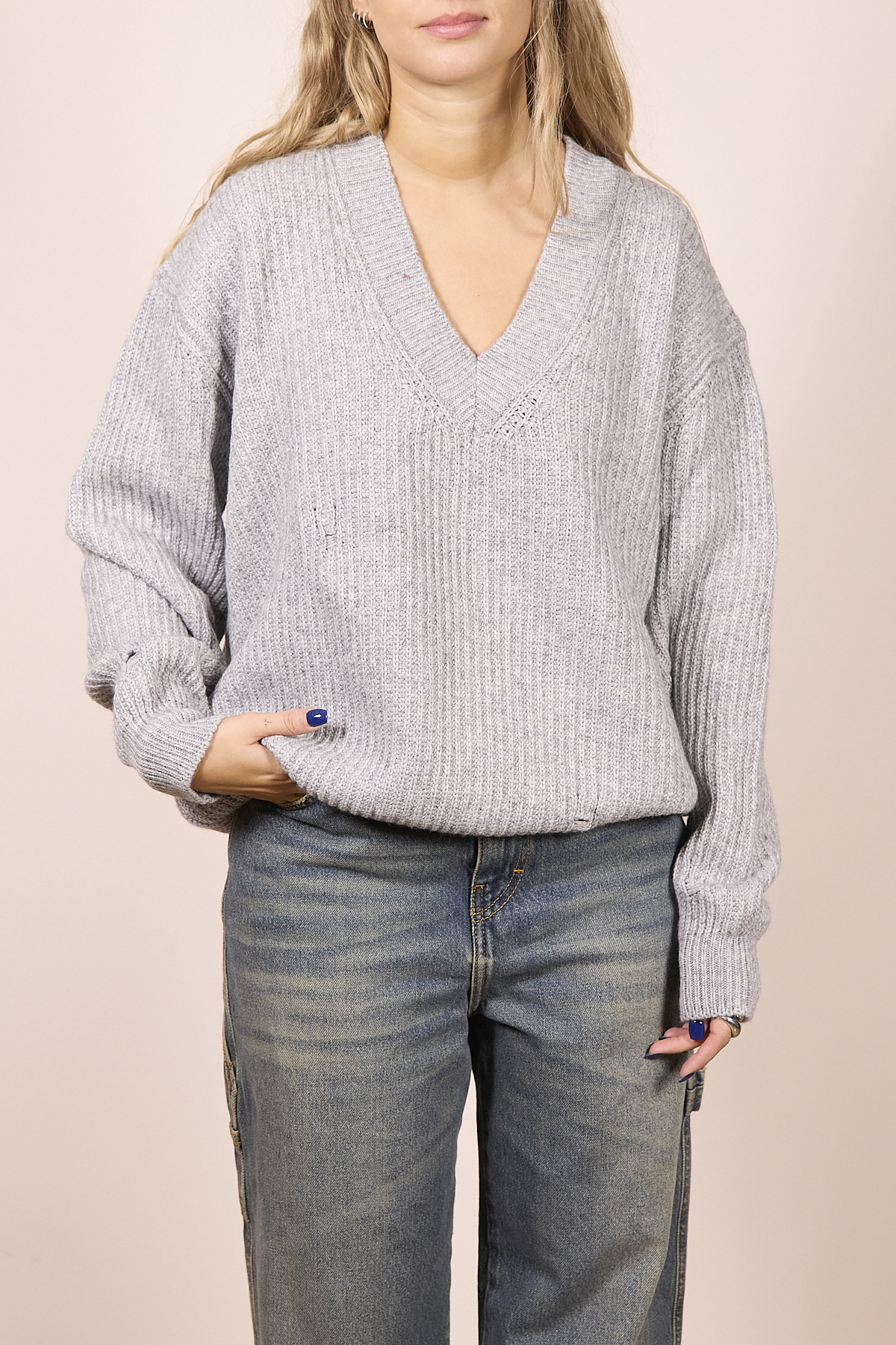 Maglione over con scollo a V con rotture programmate. 40% Viscosa 30% Poliammide 25% Lana 5% Cashmere
