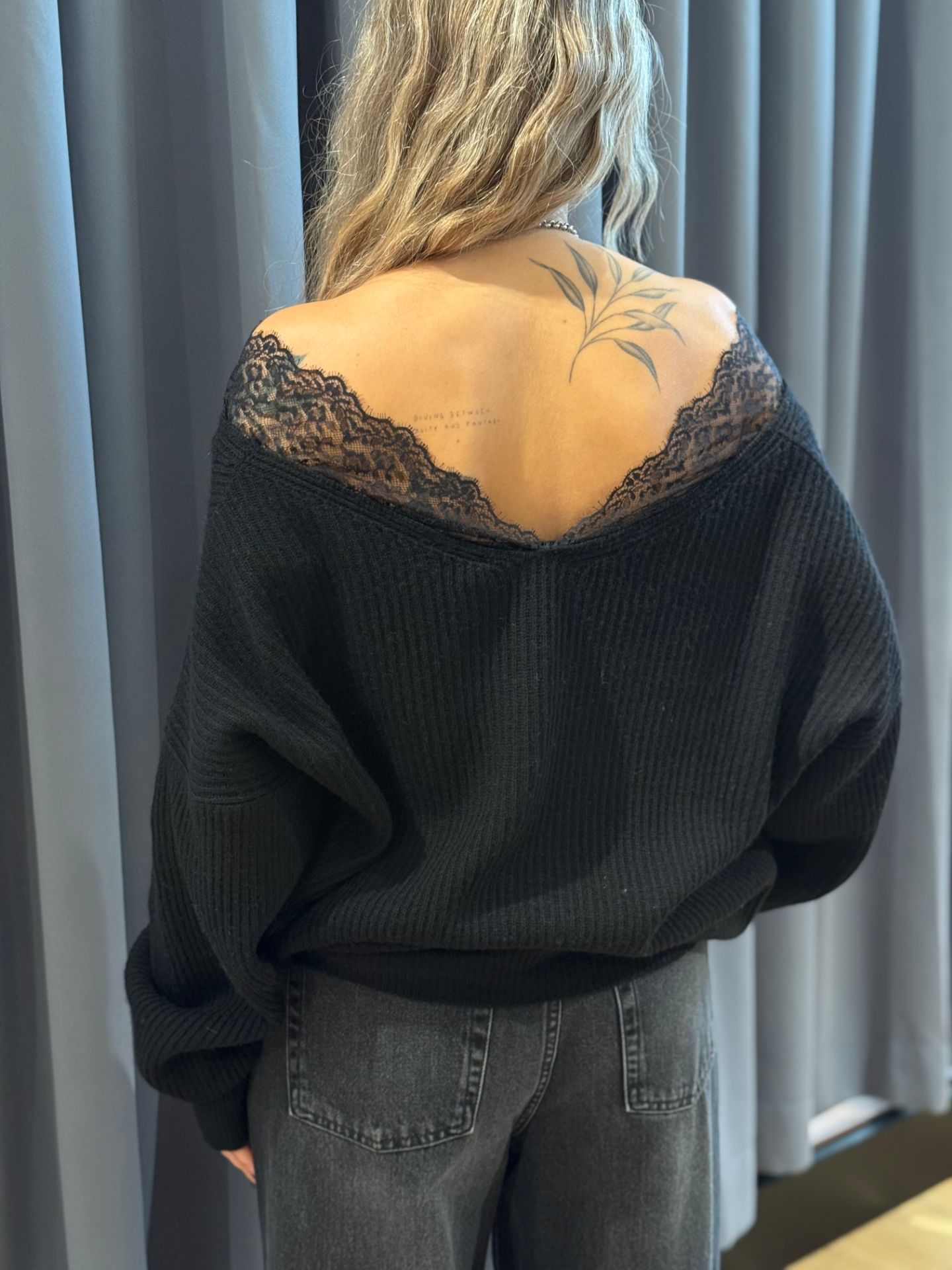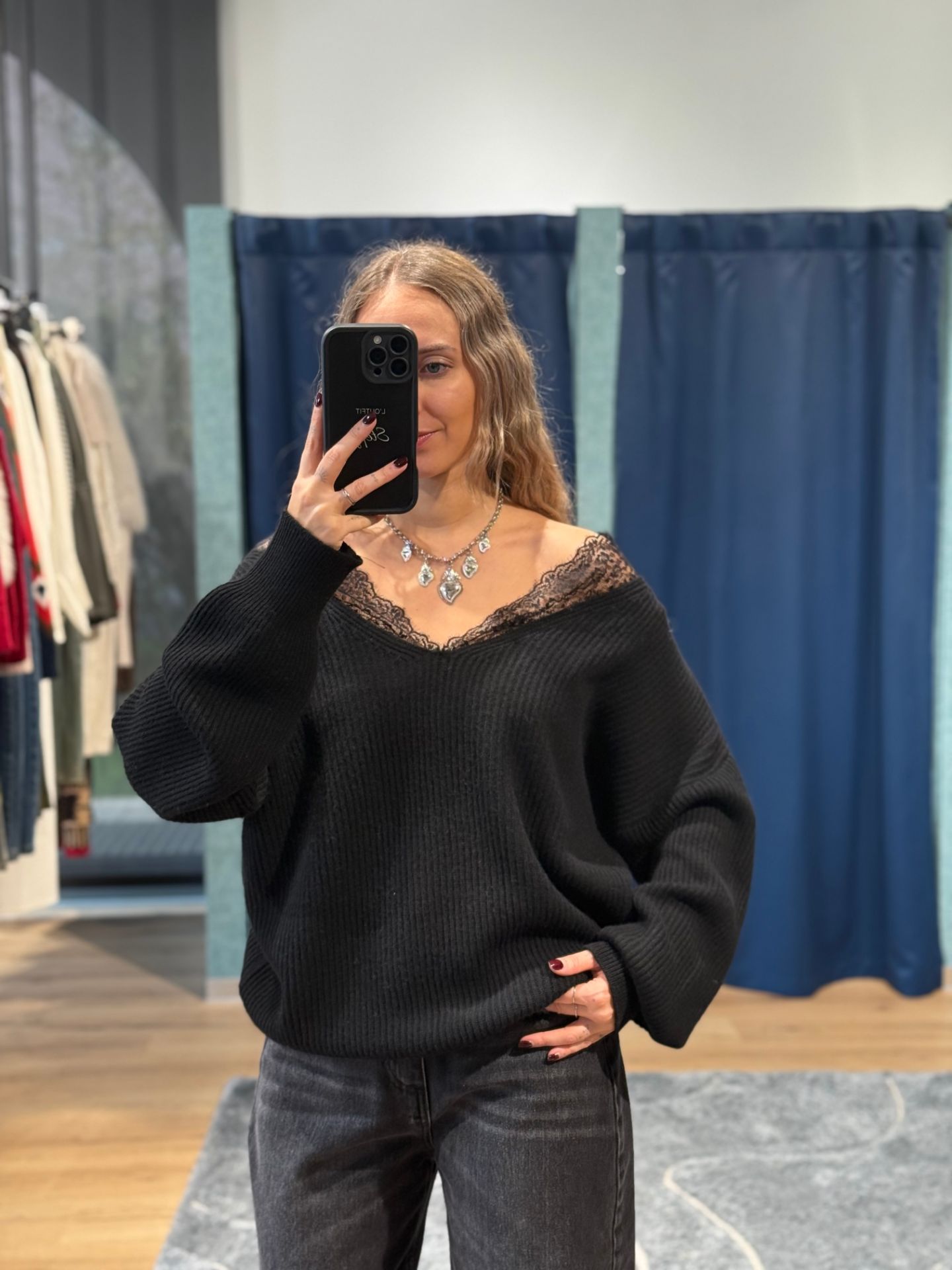Maglione morbido con dettaglio in pizzo sullo scollo. Misto lana e cashmere.