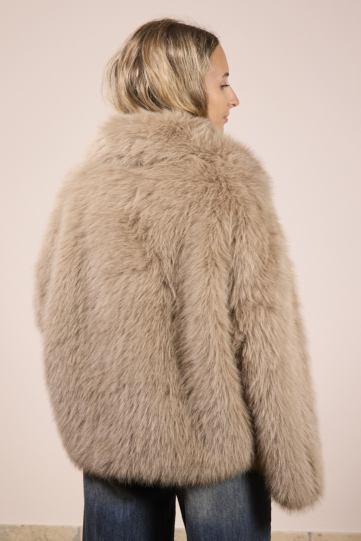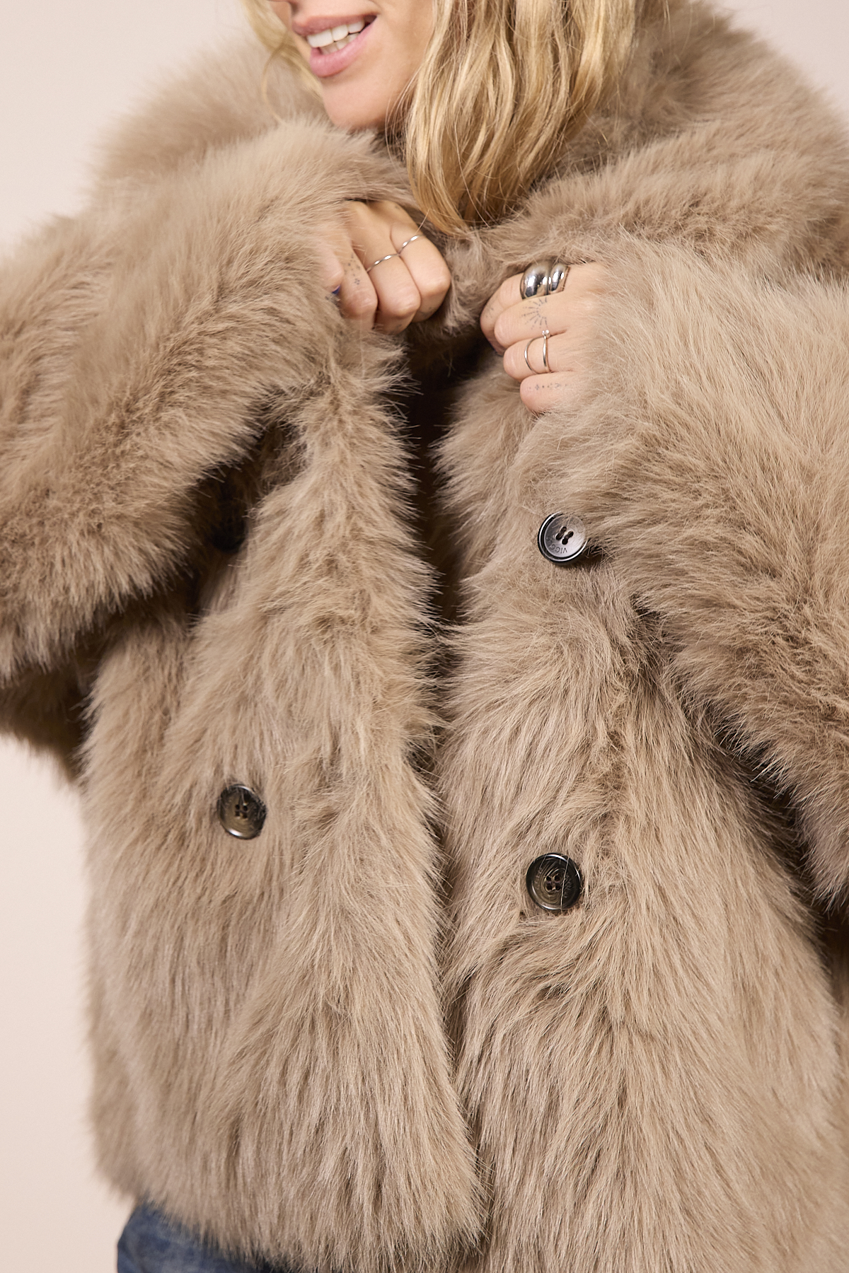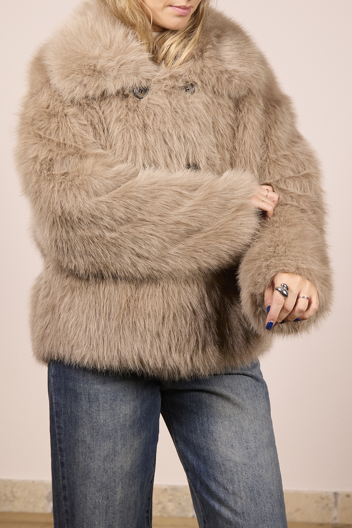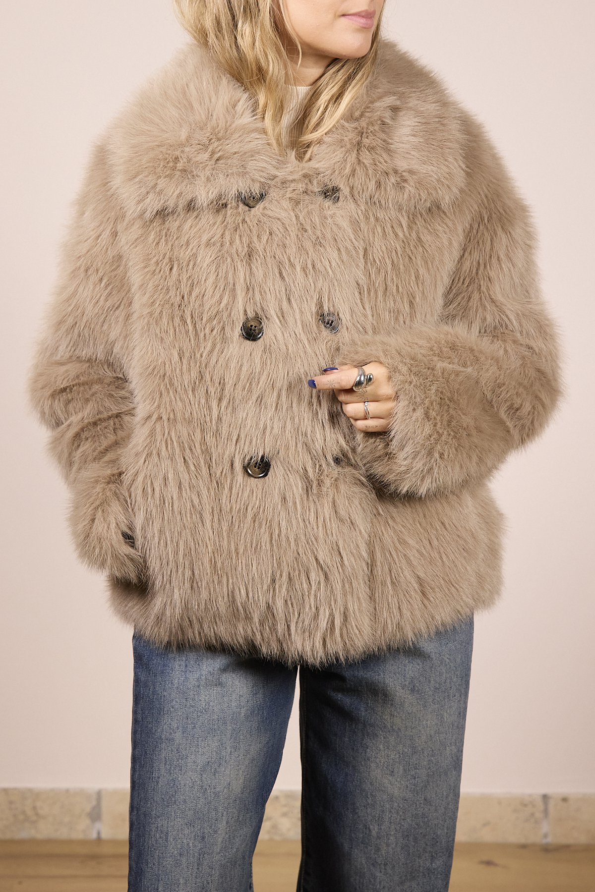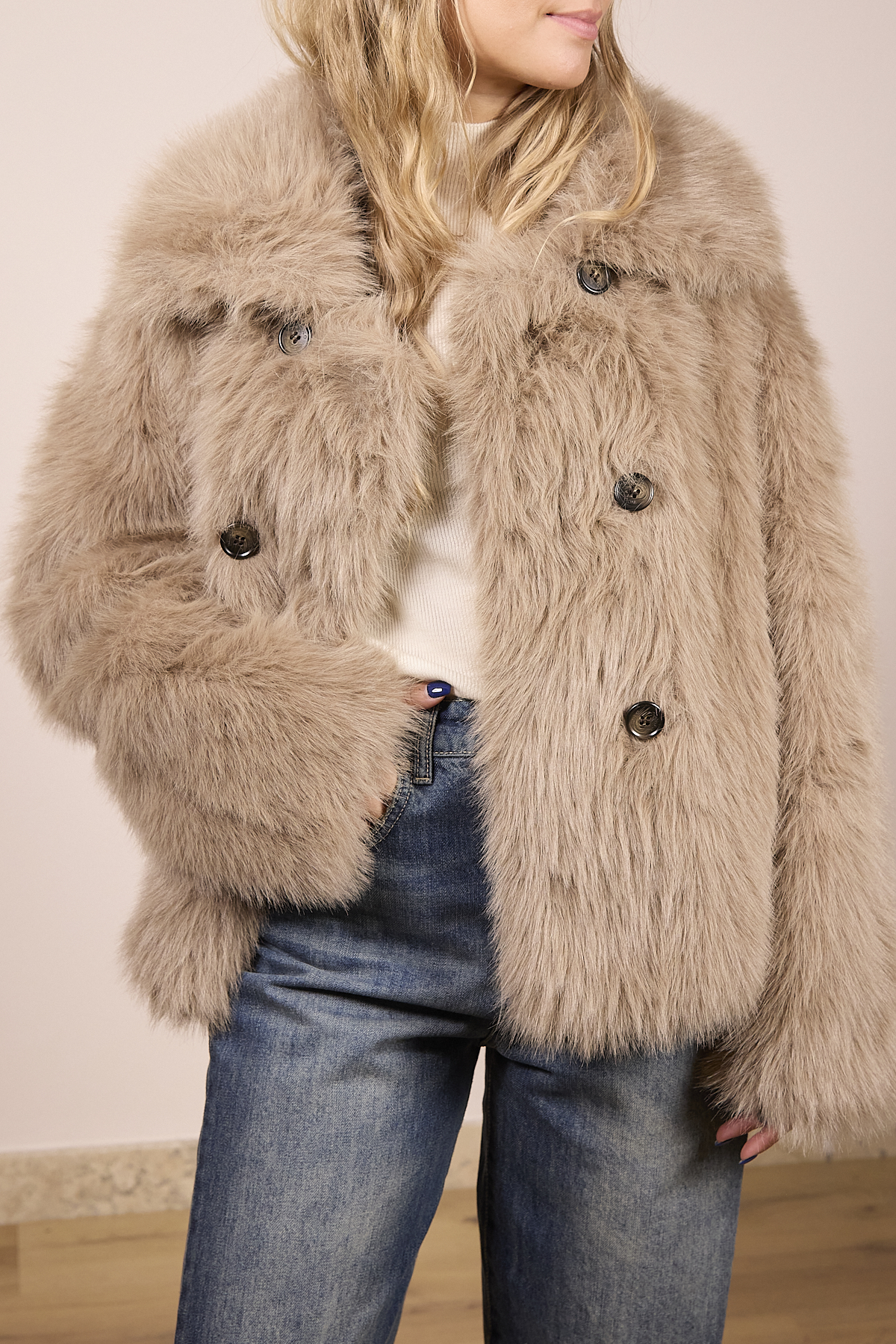 Pelliccia beige con chiusura a bottoni doppio petto.